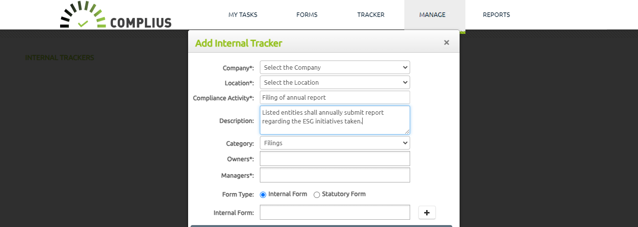 The complexity of ESG implementation, demands that every department in an organization, contribute to a matrix of reporting with Director-level oversight. Legal-tech solutions, such as Complius®, play a crucial role in simplifying this complexity, offering transparency into task ownership and execution. Complius® uniquely facilitates the maintenance of internal activities within an entity, contributing to the cultivation of a compliance-driven culture.